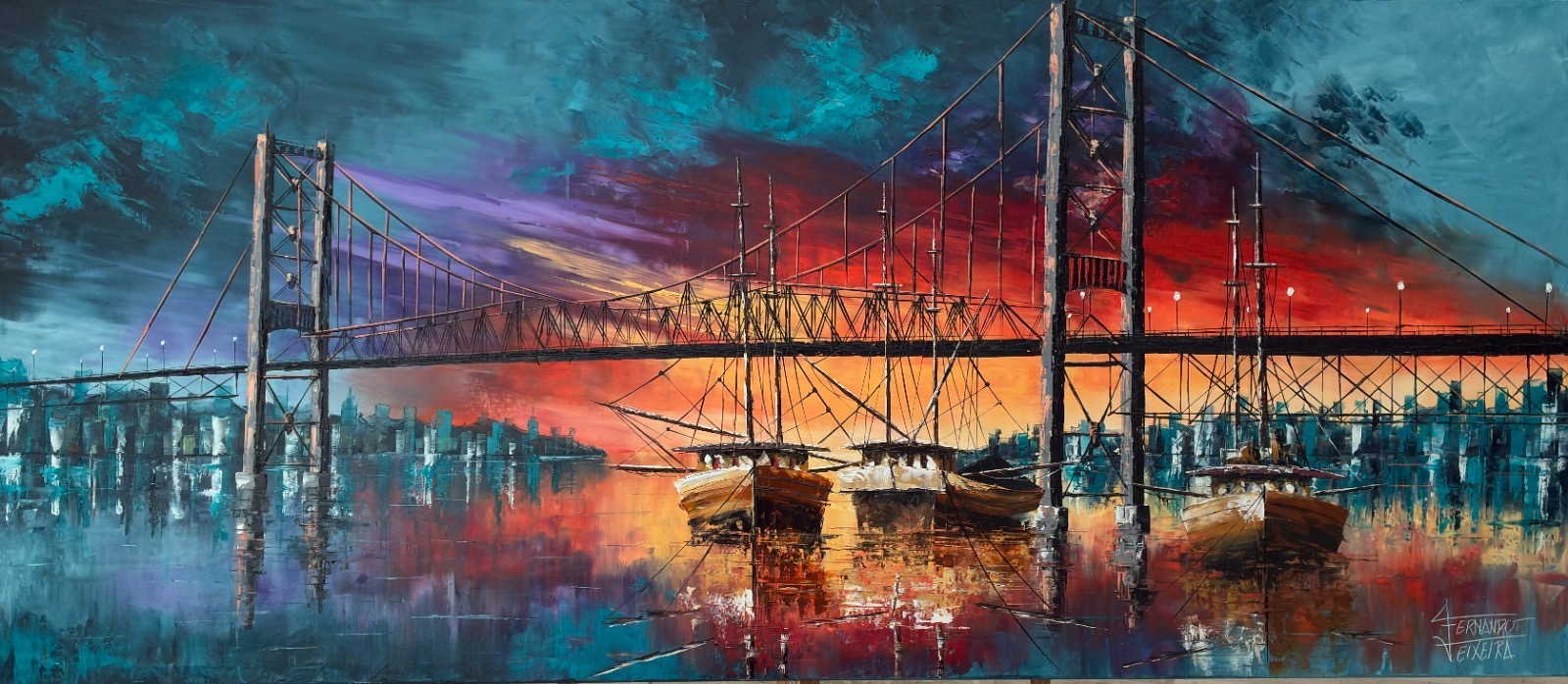 A mostra reúne obras em óleo sobre tela assinadas por pai e filho: Velmo Teixeira e Fernando Teixeira. A técnica espatulada, marca registrada da dupla, surge em composições impressionistas cheias de movimento, textura e personalidade.