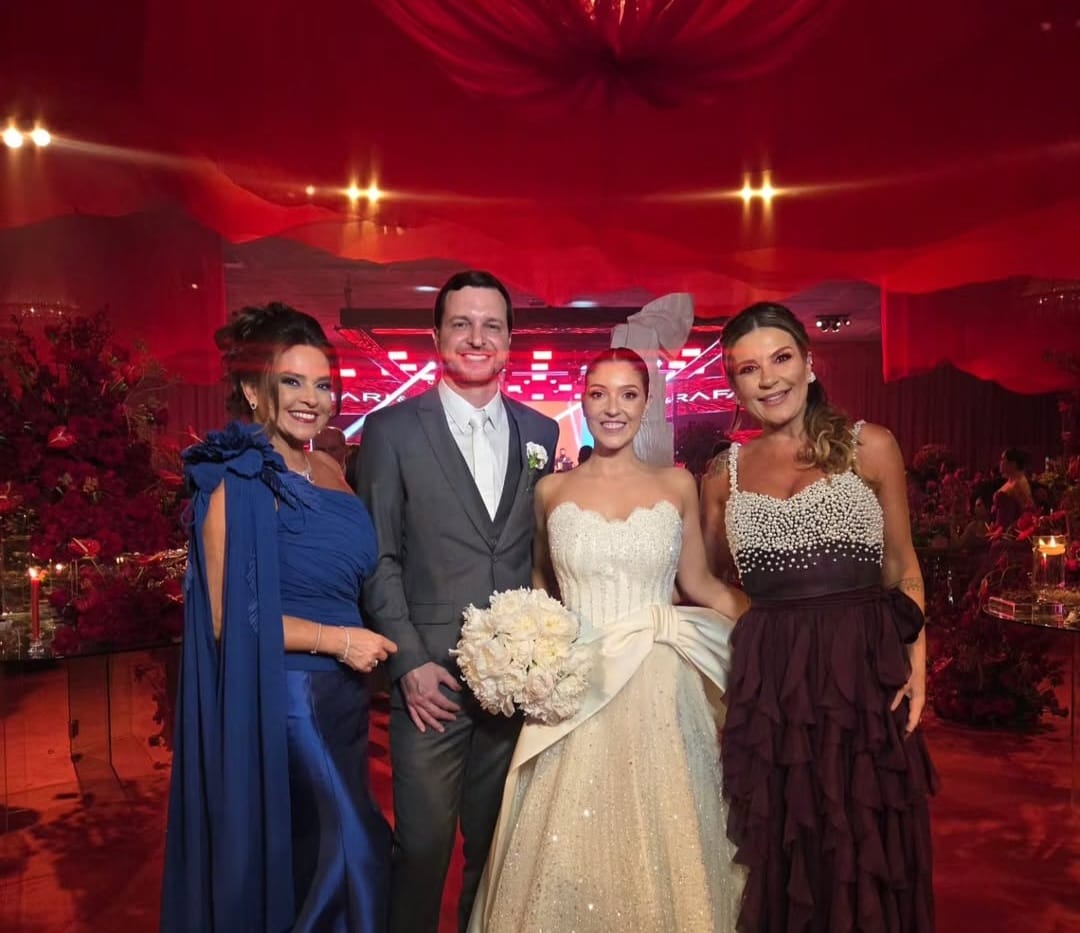 A cerimônia religiosa aconteceu na Basílica Menor de Içara, mas o grande espetáculo foi mesmo a festa: uma recepção nos salões do Flor de Liz, que mais parecia um verdadeiro palácio parisiense, da decoração impecável ao buffet de altíssimo nível.