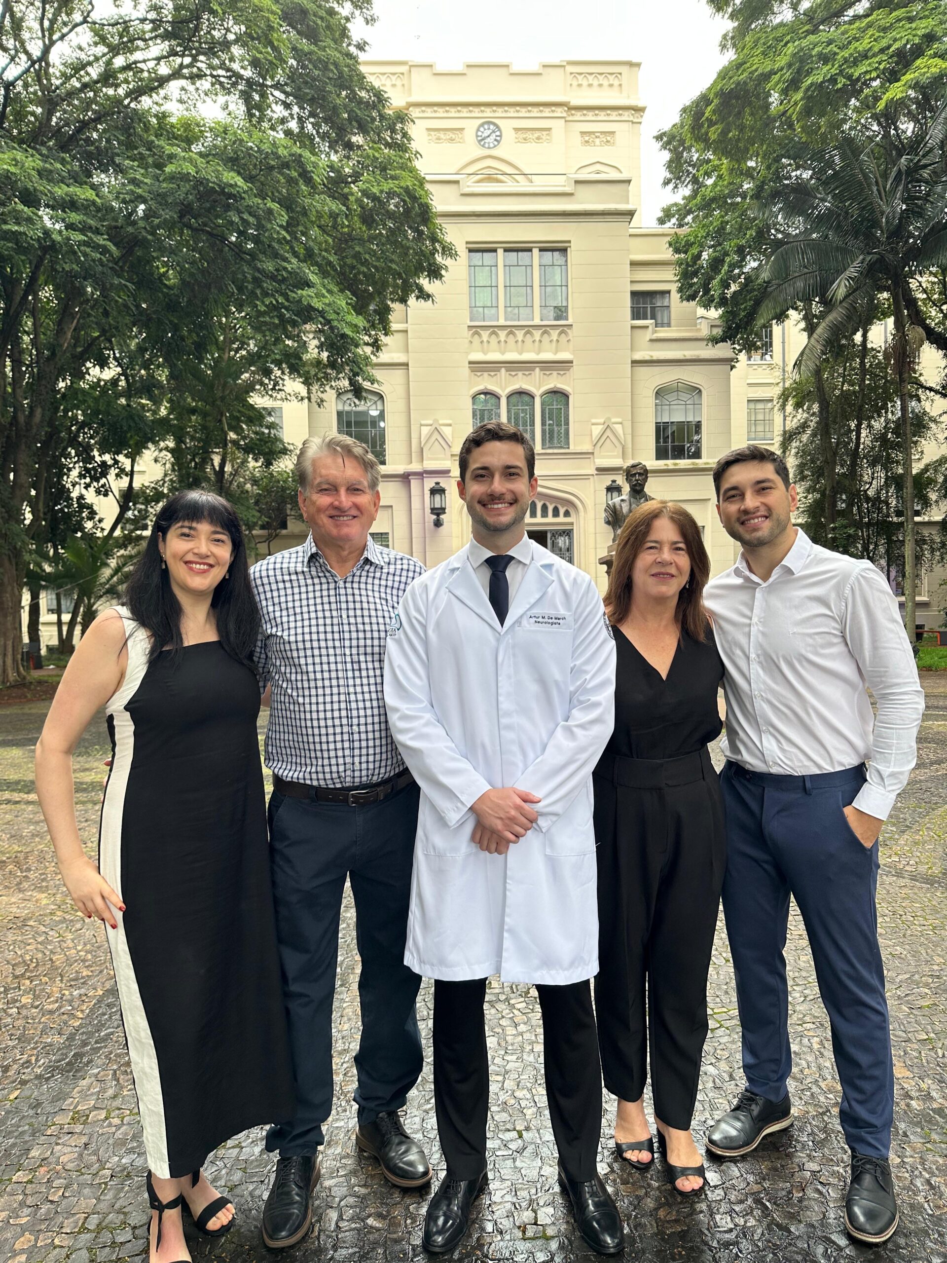 Na imagem, Arthur aparece ao lado da família — Nicole, Itacir, Sônia e Enzo — celebrando mais essa conquista que reforça a presença de profissionais altamente qualificados na área da saúde em Criciúma.