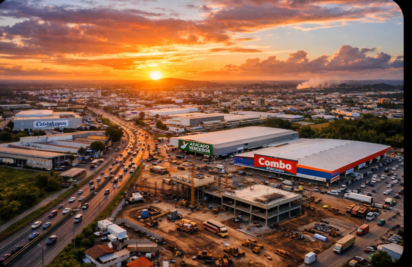 Já nas proximidades da Cristalcopos, o grupo Giassi inicia a construção de mais um grande empreendimento: um novo atacarejo da bandeira Combo, ampliando ainda mais sua presença no município.