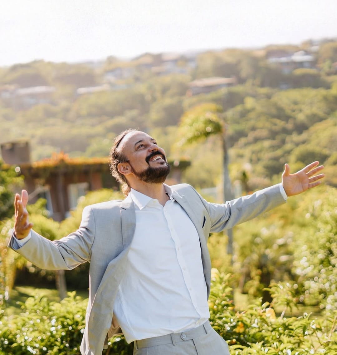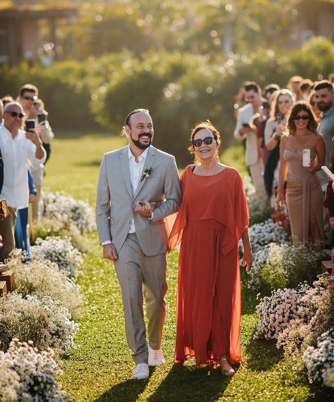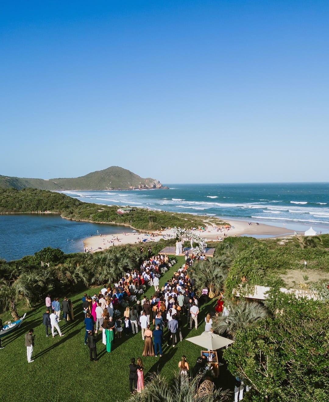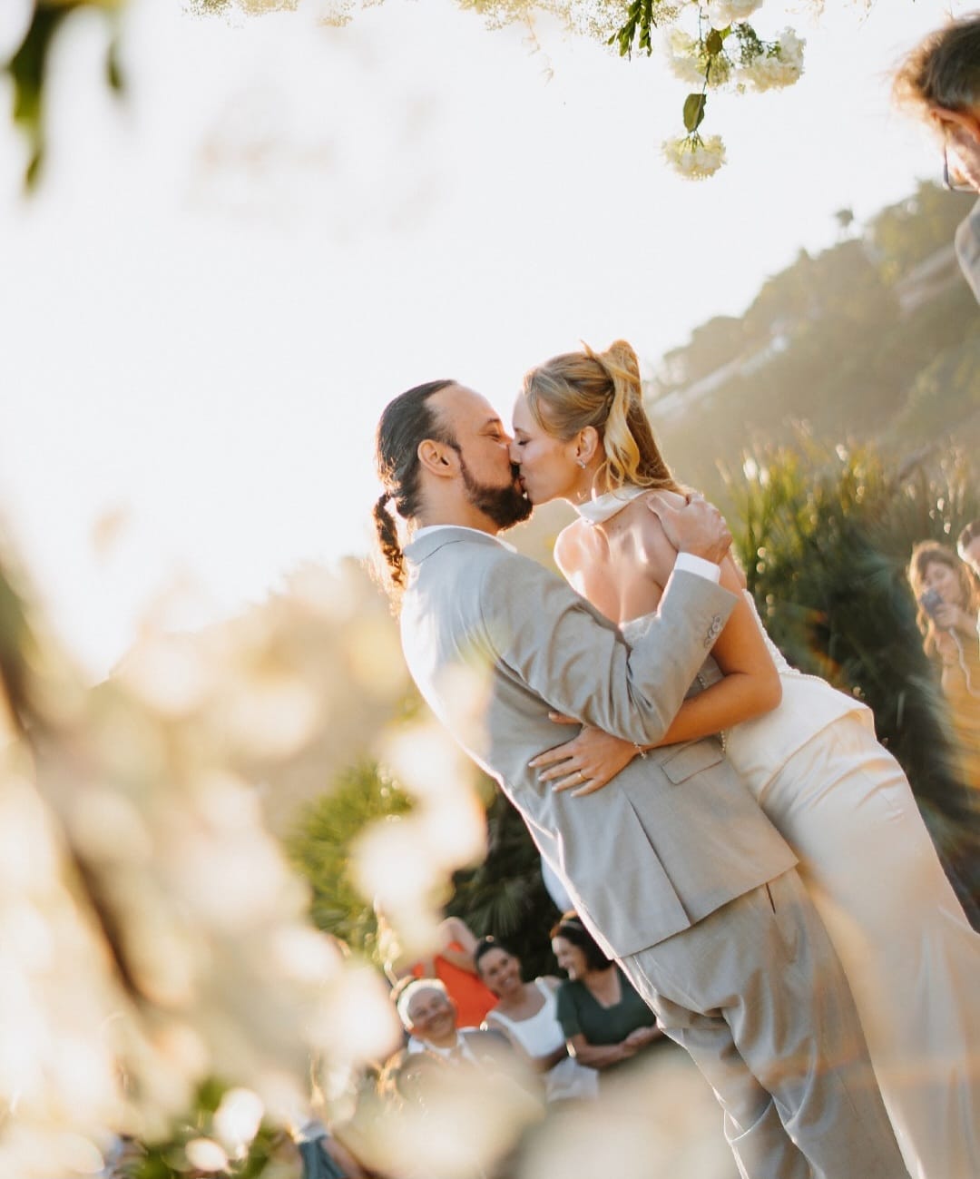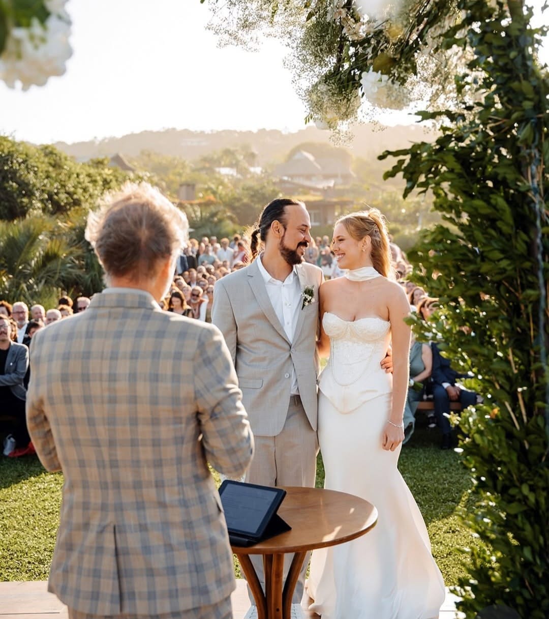 O cenário paradisíaco combinou perfeitamente com o clima de emoção que tomou conta do evento. Gabriel surgiu elegante em um terno cinza claro, enquanto Gabriela encantou os convidados com um vestido branco clássico.